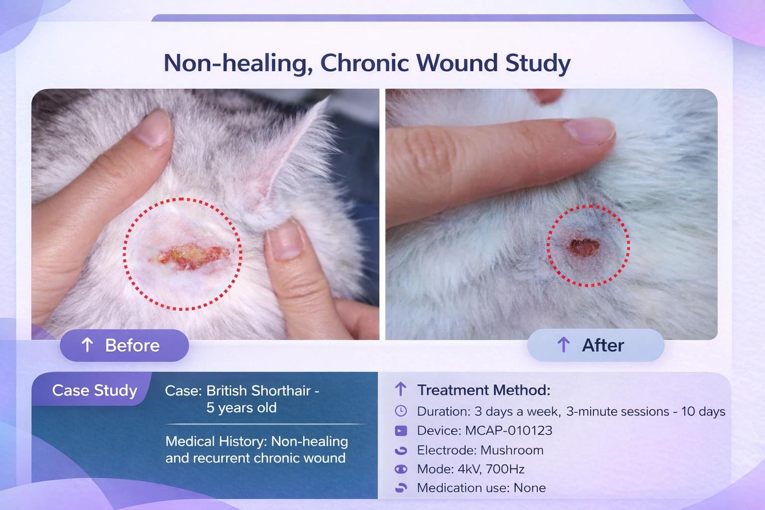 Common skin condition in pets that can cause inflammation, redness, and itching. Treatment of eczema can be challenging, as conventional treatments such as steroids and antibiotics can have negative side effects and may not always be effective. Cold plasma technology has the potential to provide a safe and effective alternative to traditional treatments, with fewer side effects and improved outcomes.